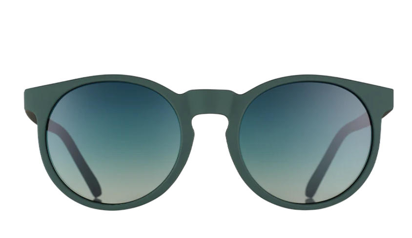 Round green sunglasses with sleek polarized lenses and UV400 protection for active hipsters. Vintage-inspired design with a special grip frame that stays put no matter how hard you sway at that indie show. Plus, gradient lenses mask eye-rolls when surrounded by normie sheeple.