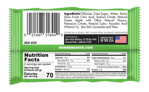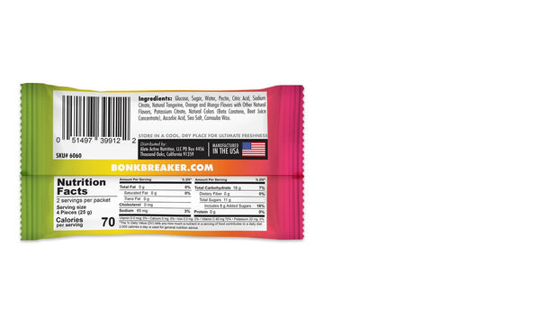 Bonk Breaker energy chews are a great choice for athletes who need energy fast. Each 4 piece serving provides 24g of fast-acting carbohydrates and plenty of electrolytes to aid in muscle contraction. Energy chews taste delicious and can be eaten in whatever portion an athlete needs for carbohydrate intake. Some flavors of chews also contain 100mg of caffeine per pack for athletes who want an extra kick for peak performance.