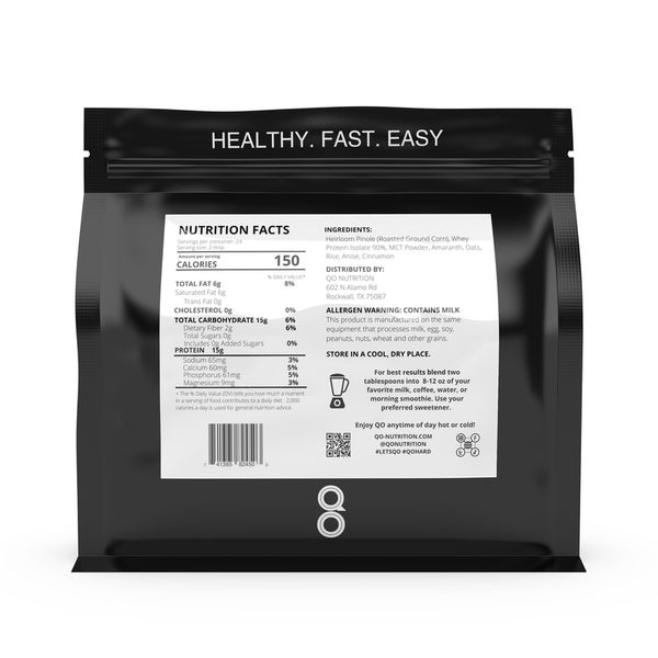 QO Complete is a meal and sports nutrition all in one. The highest quality ingredients are fire roasted to perfection and ground into a power-packed powder. It has a perfect macronutrient breakdown to help you feel and perform your best. Use QO Complete any time of day and before, during, or after training.