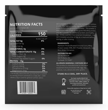 QO Complete is a meal and sports nutrition all in one. The highest quality ingredients are fire roasted to perfection and ground into a power-packed powder. It has a perfect macronutrient breakdown to help you feel and perform your best. Use QO Complete any time of day and before, during, or after training.