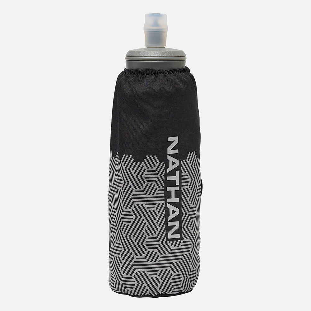 The HyperNight Pinnacle 14oz Handheld features Bold All-Over Hex reflective print and Nathan's advanced ExoShot flask technology in an updated carrier and grip-free strap for unmatched comfort. It boasts an expandable pocket for keys and essentials, ideal for marathons, trail runs, hikes, climbs, and more.